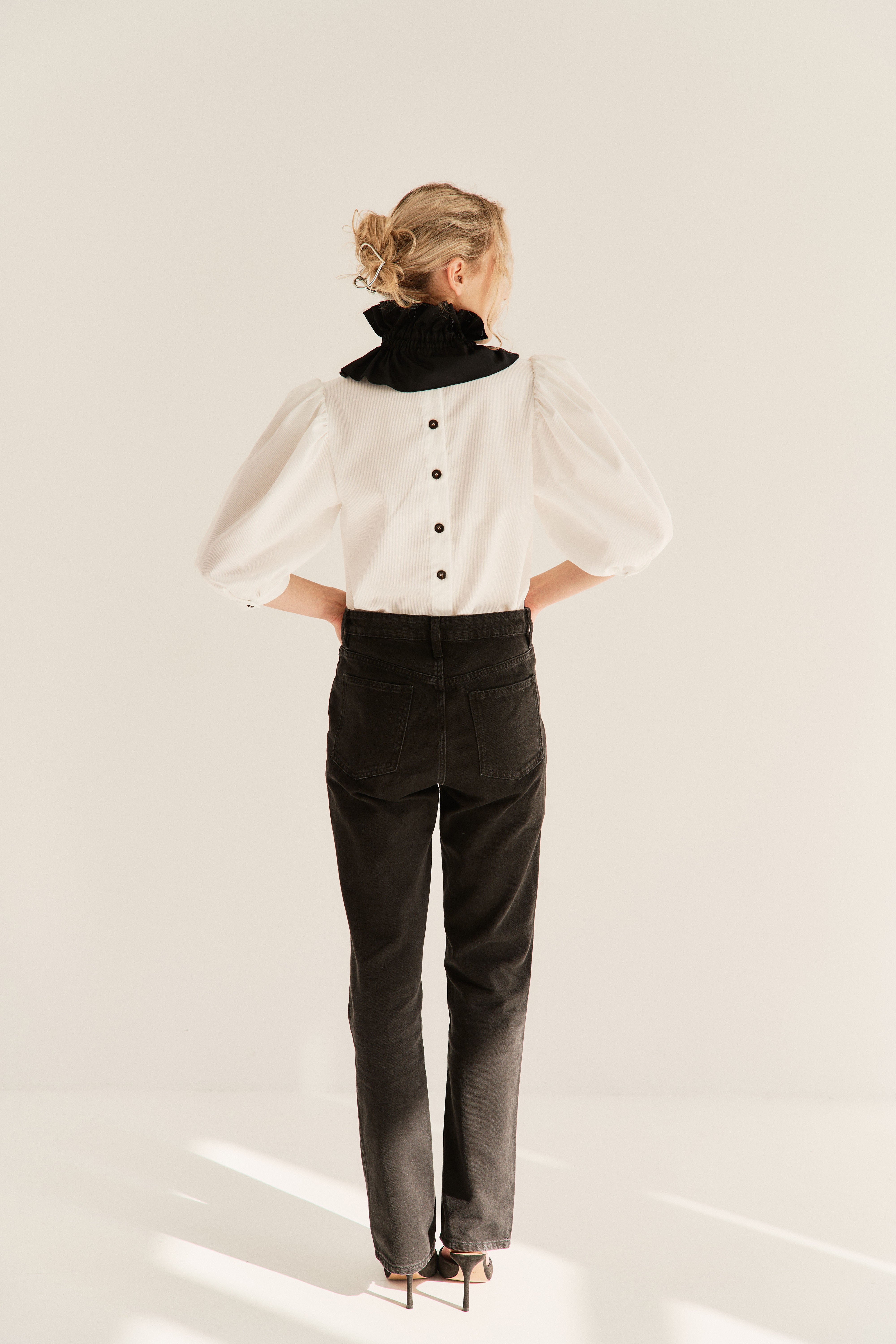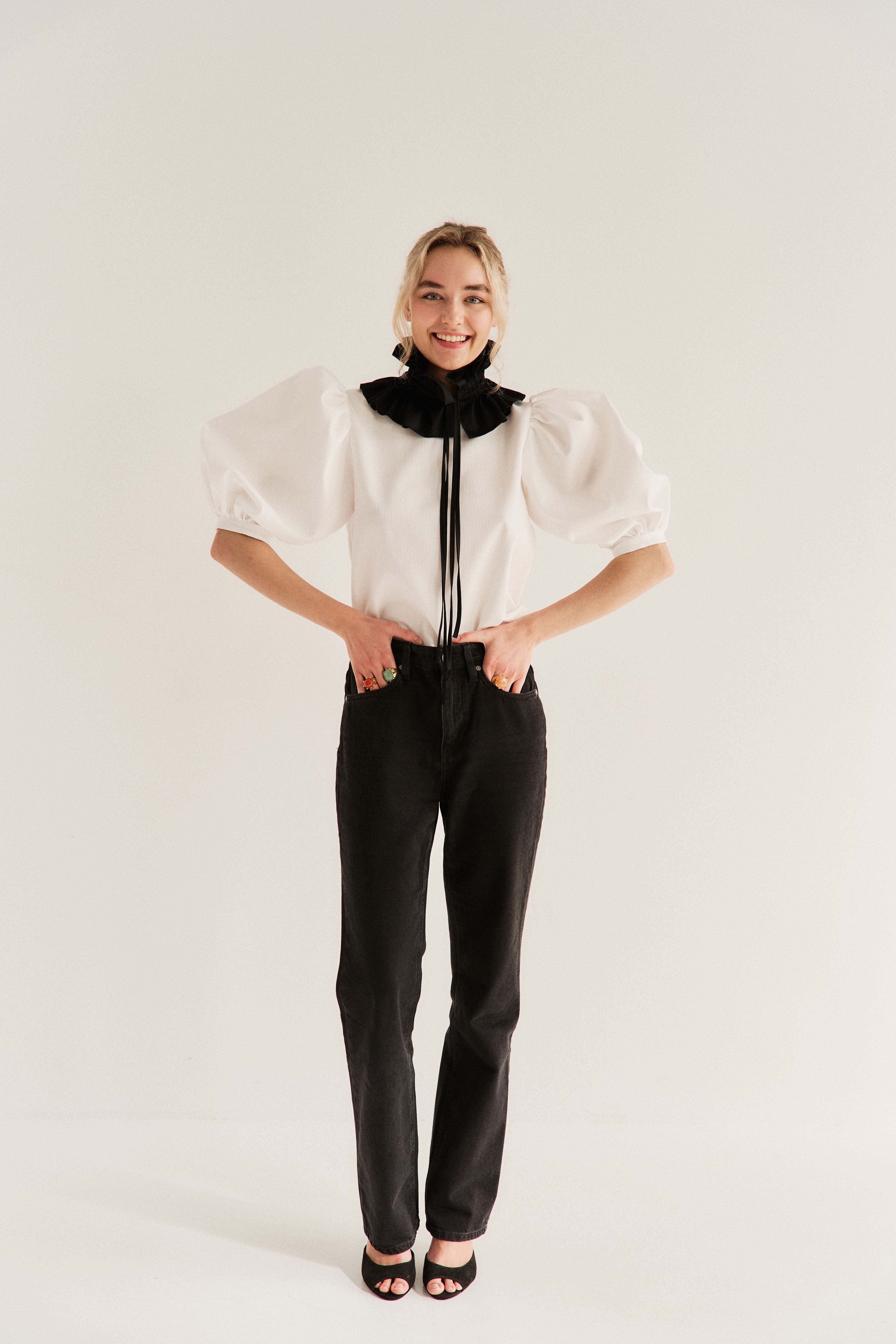 Zestaw kołnierzyk z białą bluzką i czarnymi jeansami. Kontrast jest prosty, ale bardzo wyrafinowany — dokładnie taki, jaki lubimy najbardziej.