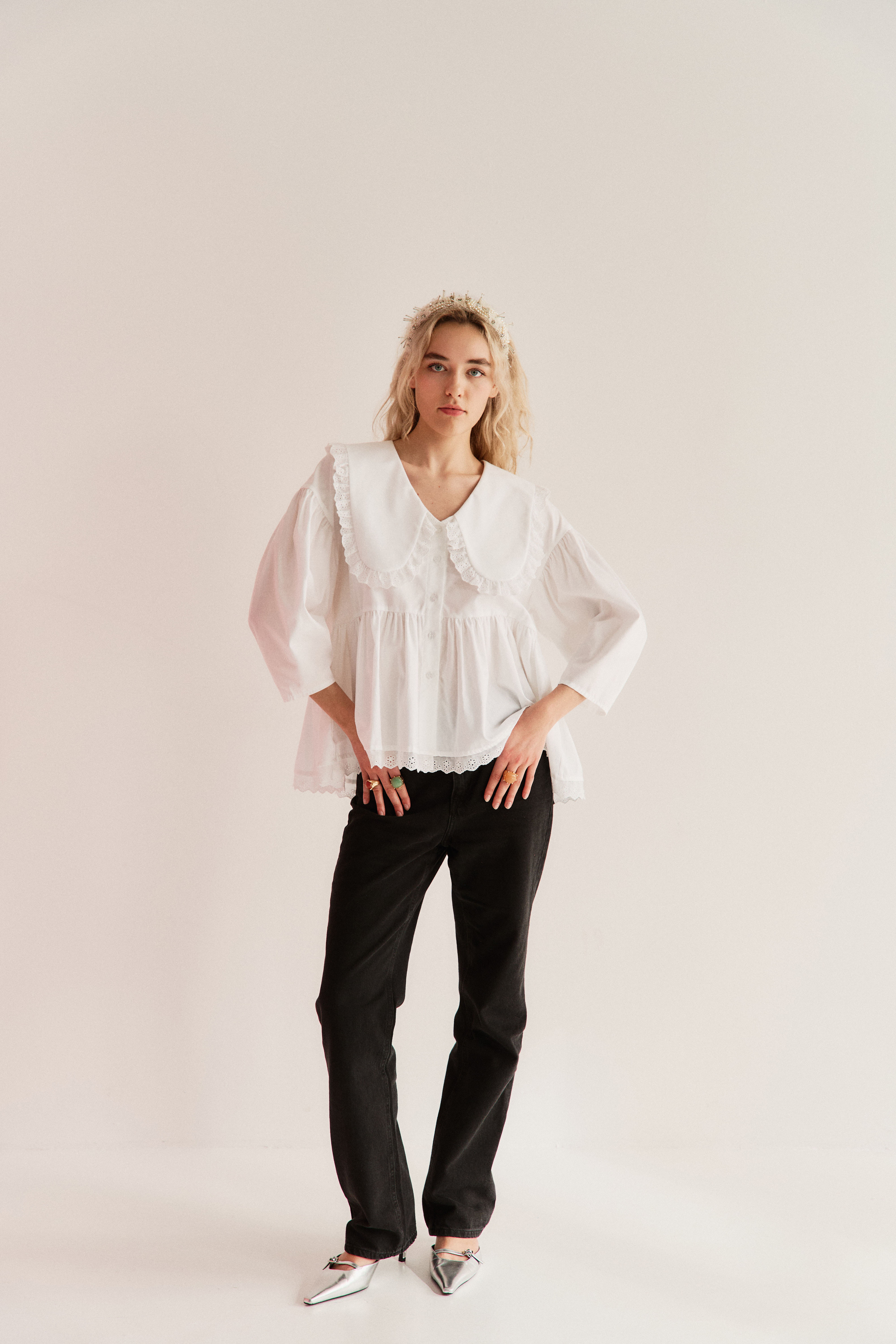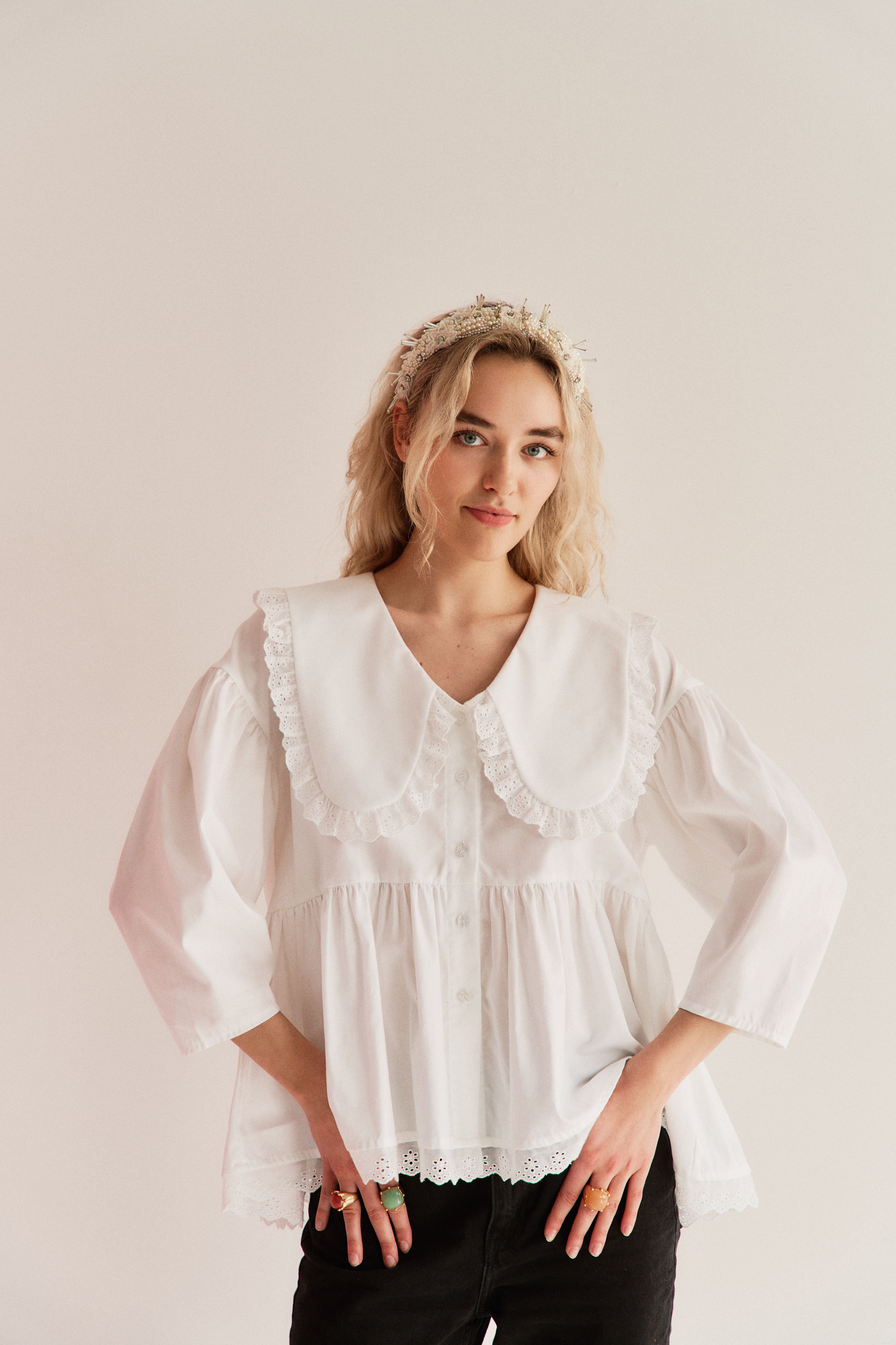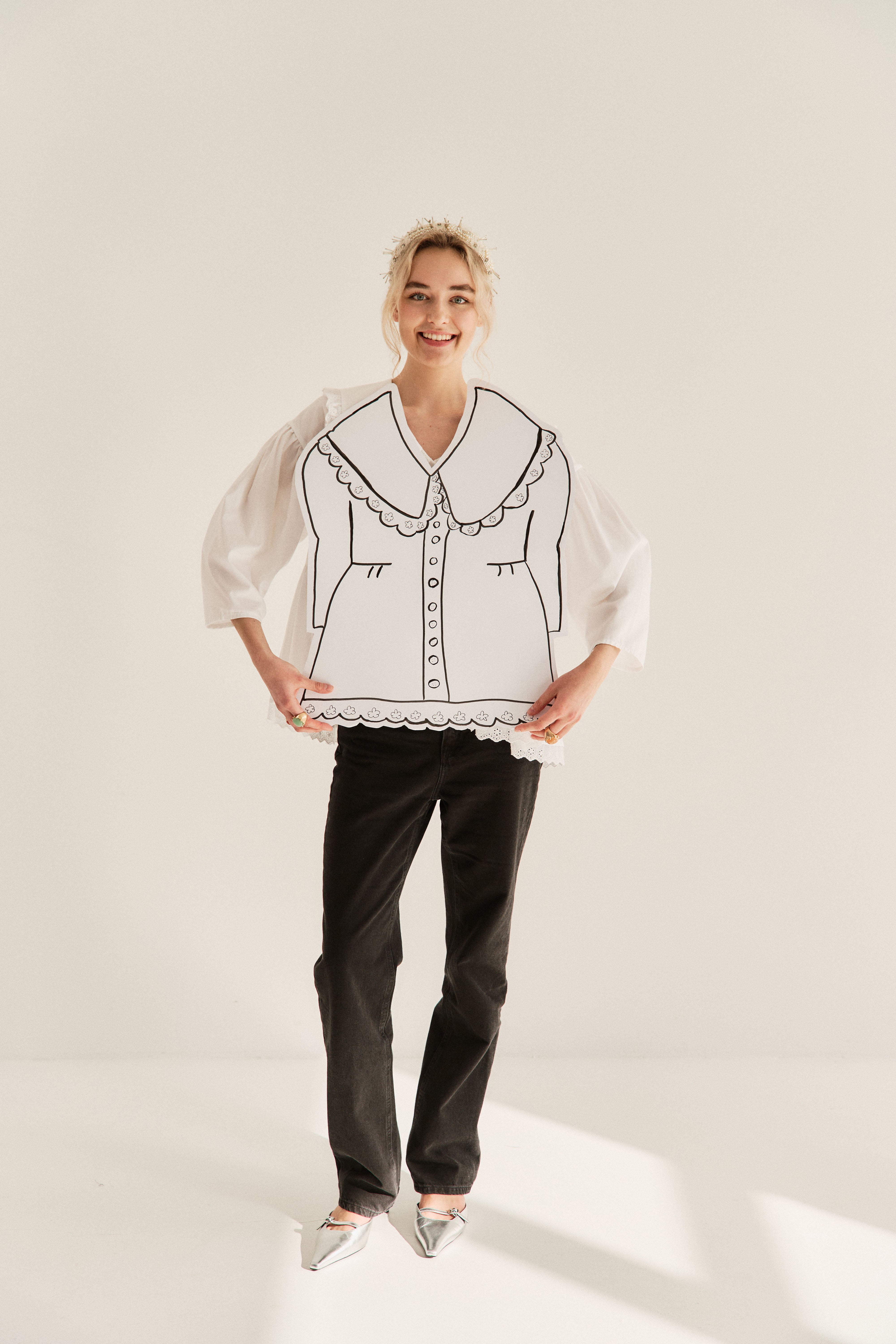 Zjawiskowy kołnierz XL wykończony koronką otula szyję jak miękka rama dla Twojej osobowości. Ten sam subtelny motyw koronki pojawia się u dołu – jak niedopowiedziane zdanie w romantycznym liście. Bufiaste rękawy 3/4, drobne guziczki, luźna forma – wszystko tu oddycha swobodą i niewymuszoną elegancją.