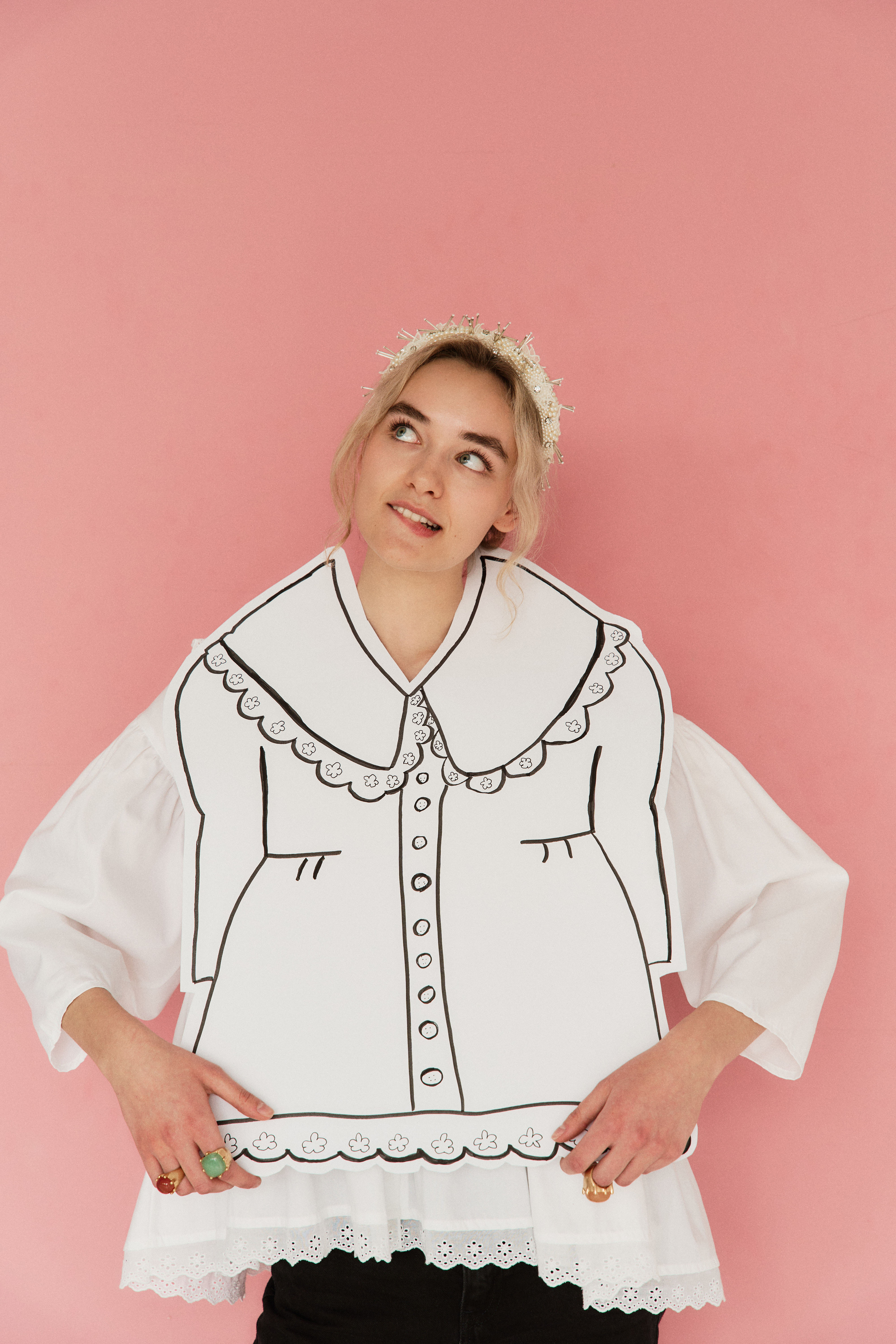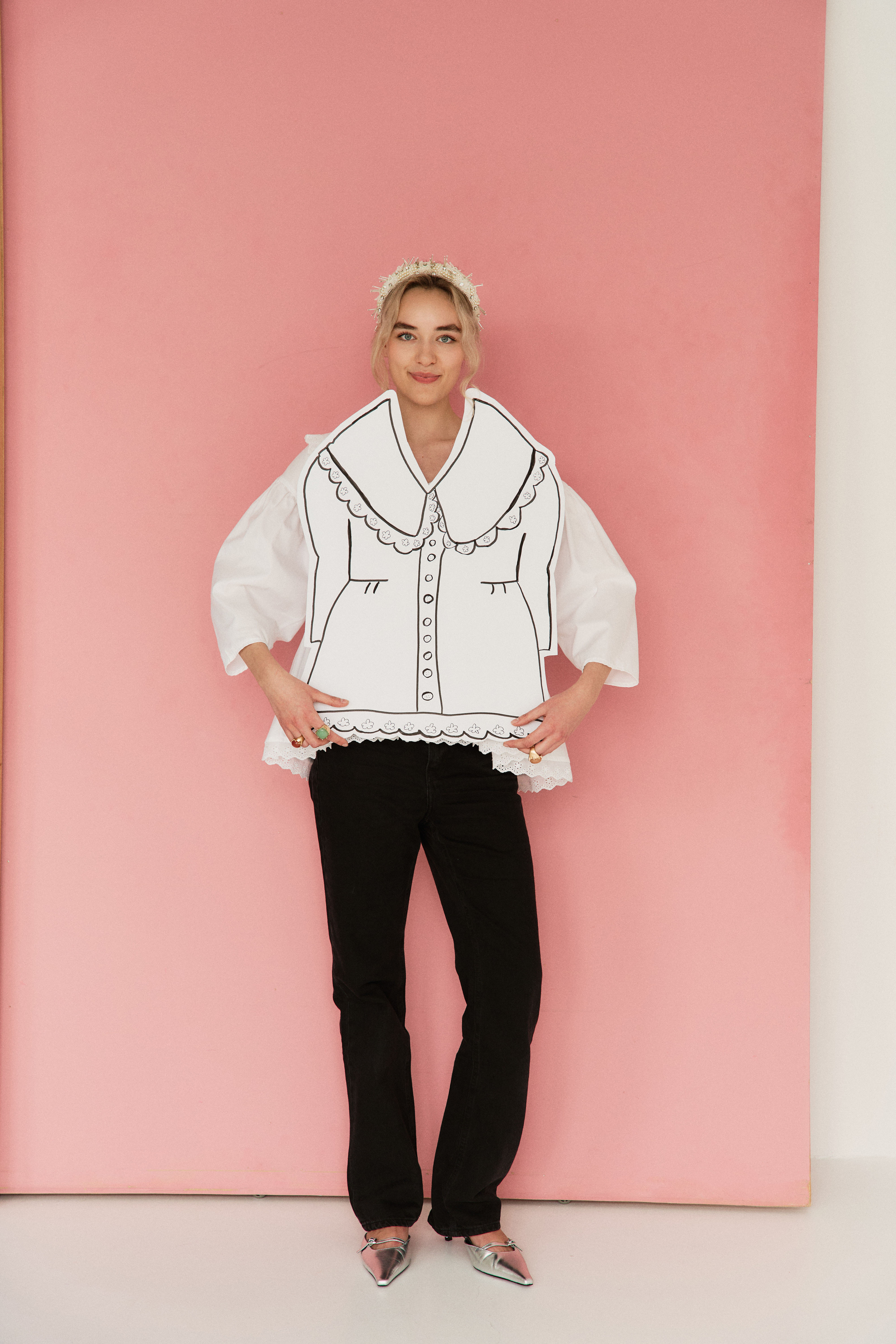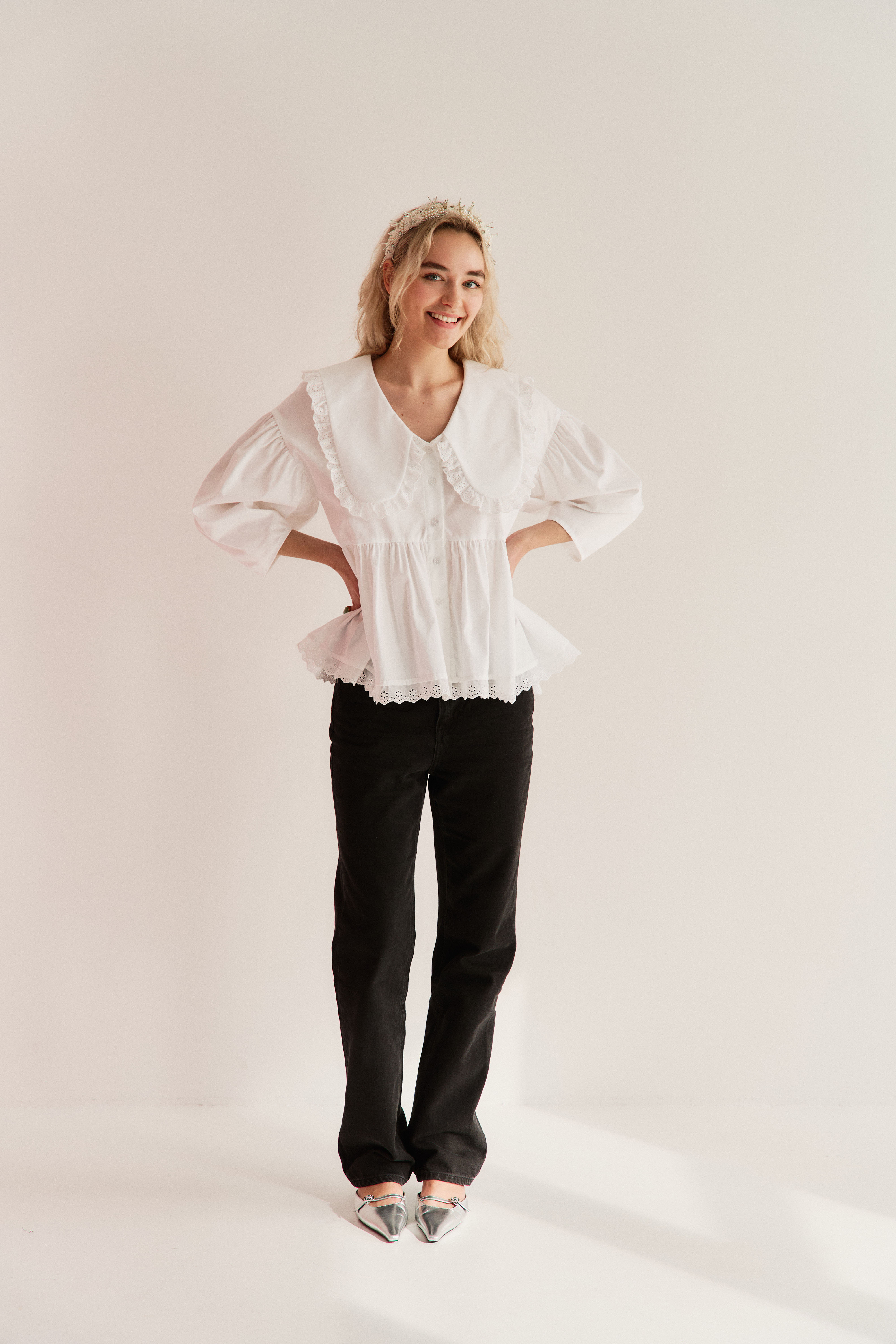 Zjawiskowy kołnierz XL wykończony koronką otula szyję jak miękka rama dla Twojej osobowości. Ten sam subtelny motyw koronki pojawia się u dołu – jak niedopowiedziane zdanie w romantycznym liście. Bufiaste rękawy 3/4, drobne guziczki, luźna forma – wszystko tu oddycha swobodą i niewymuszoną elegancją.