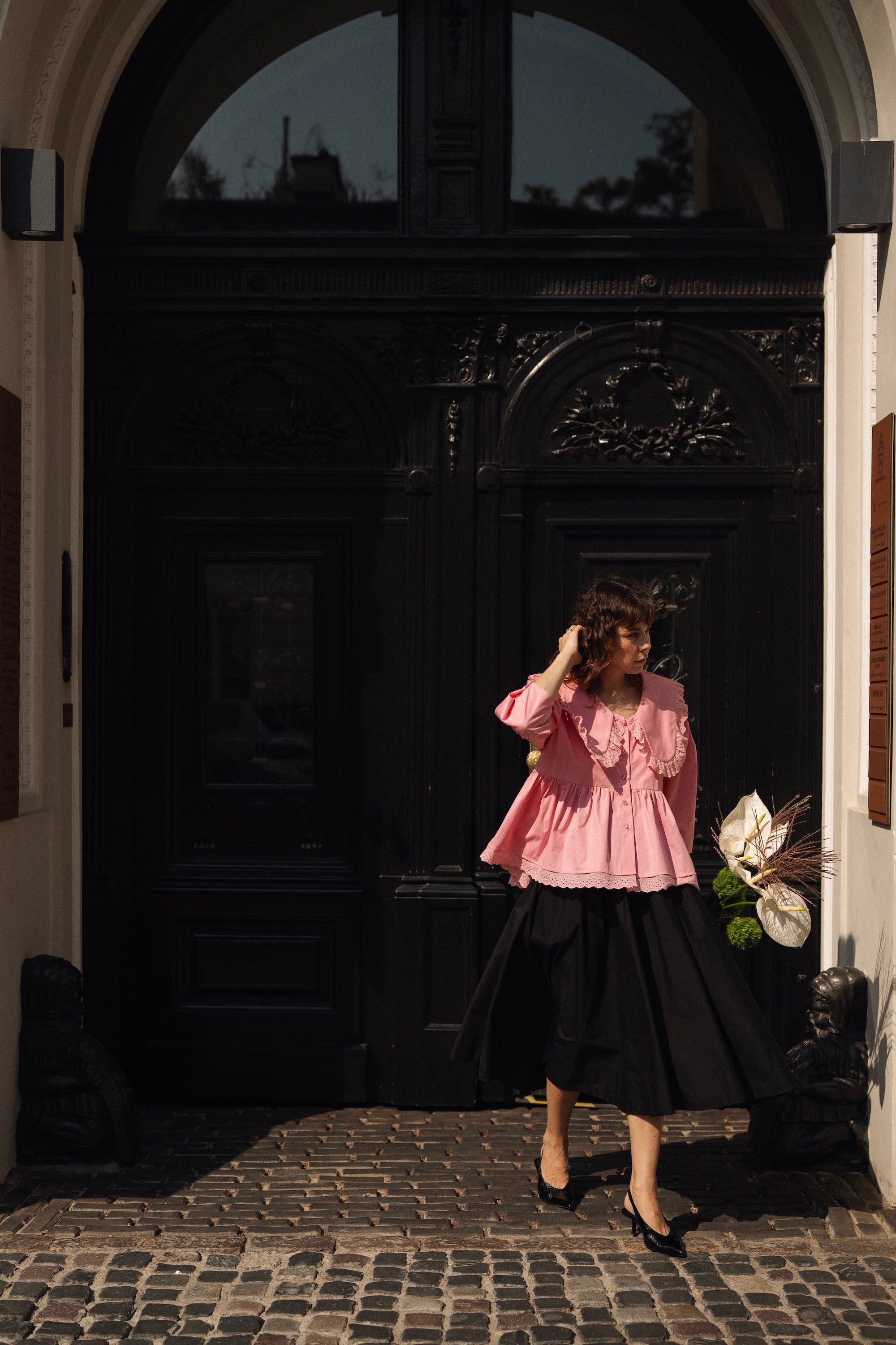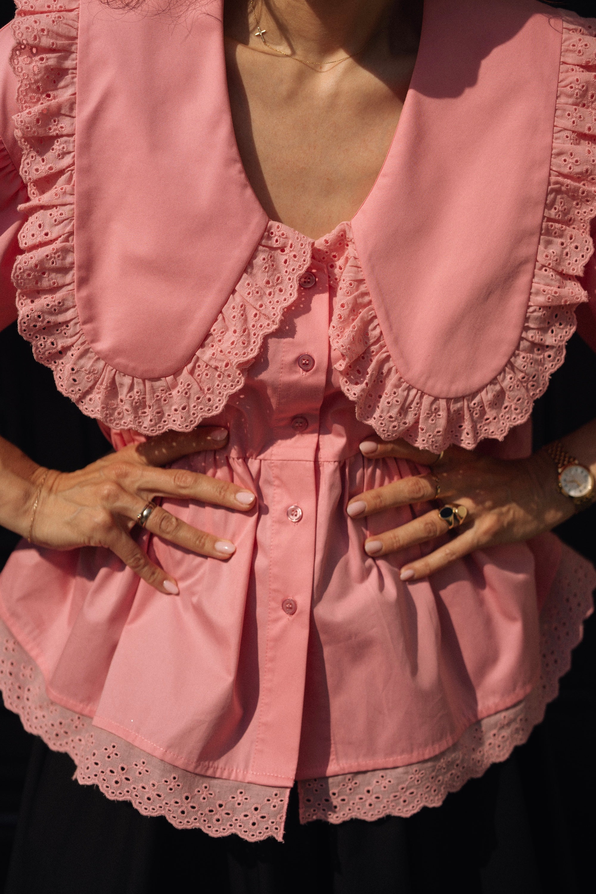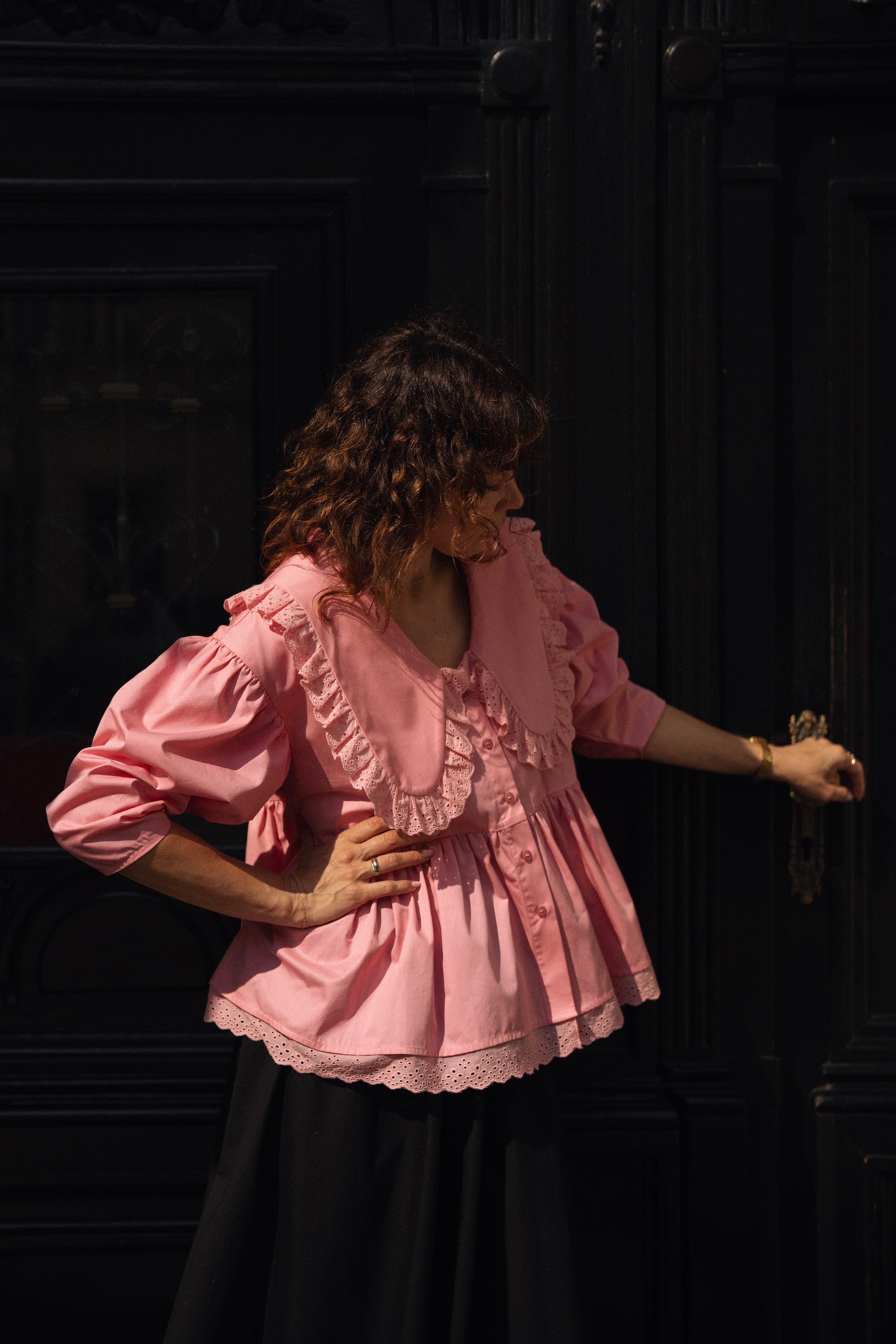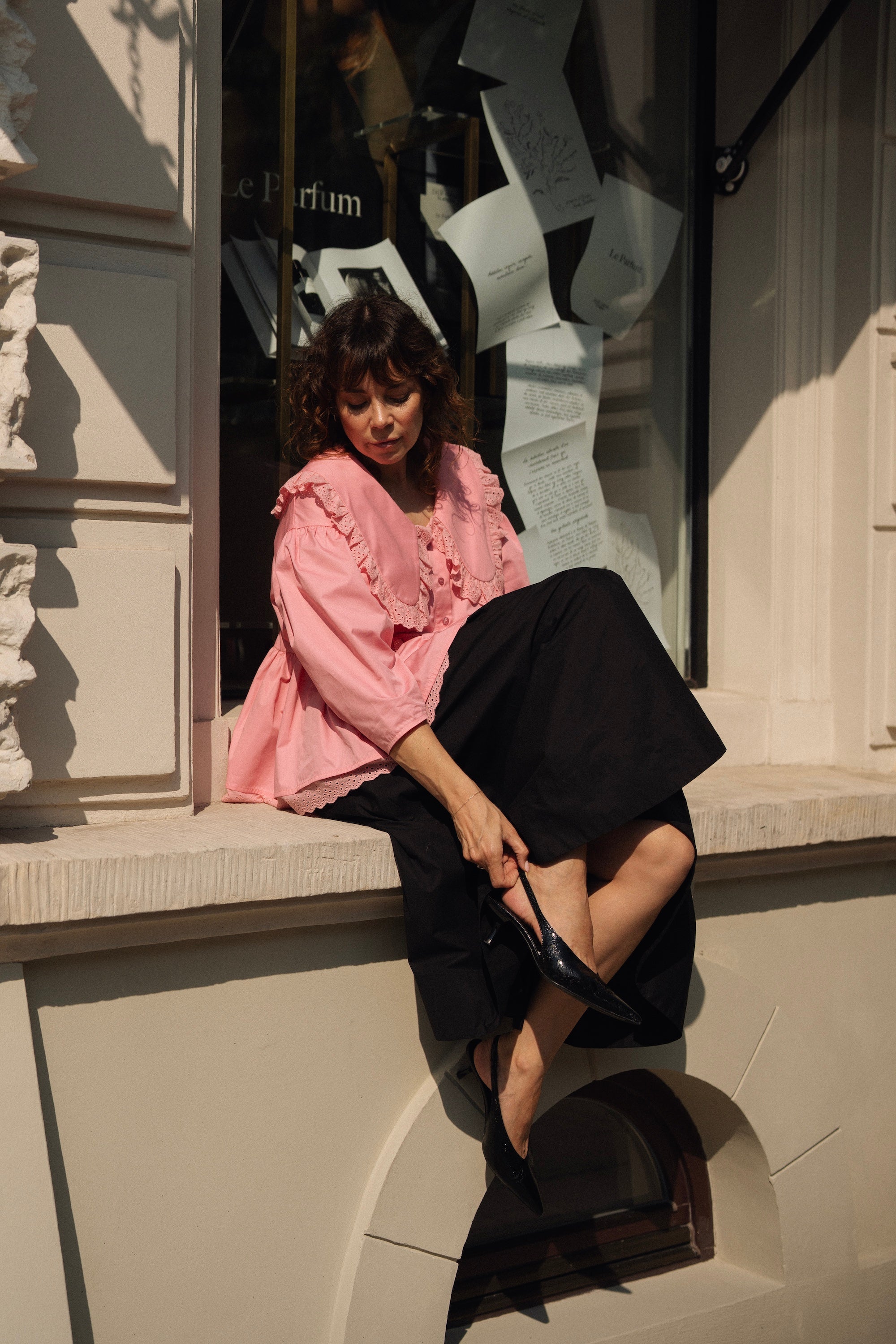 Nie musisz być słodką dziewczynką, żeby pokochać MATHILDE – ale ona i tak skradnie Ci serce. Wszystko za sprawą romantycznego kołnierzyka XXL wykończonego delikatną koronką, która pojawia się też na dole koszuli, jak subtelny finał modowego love story.