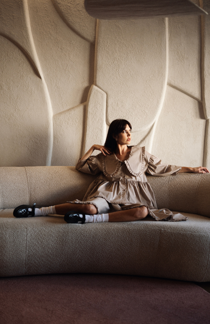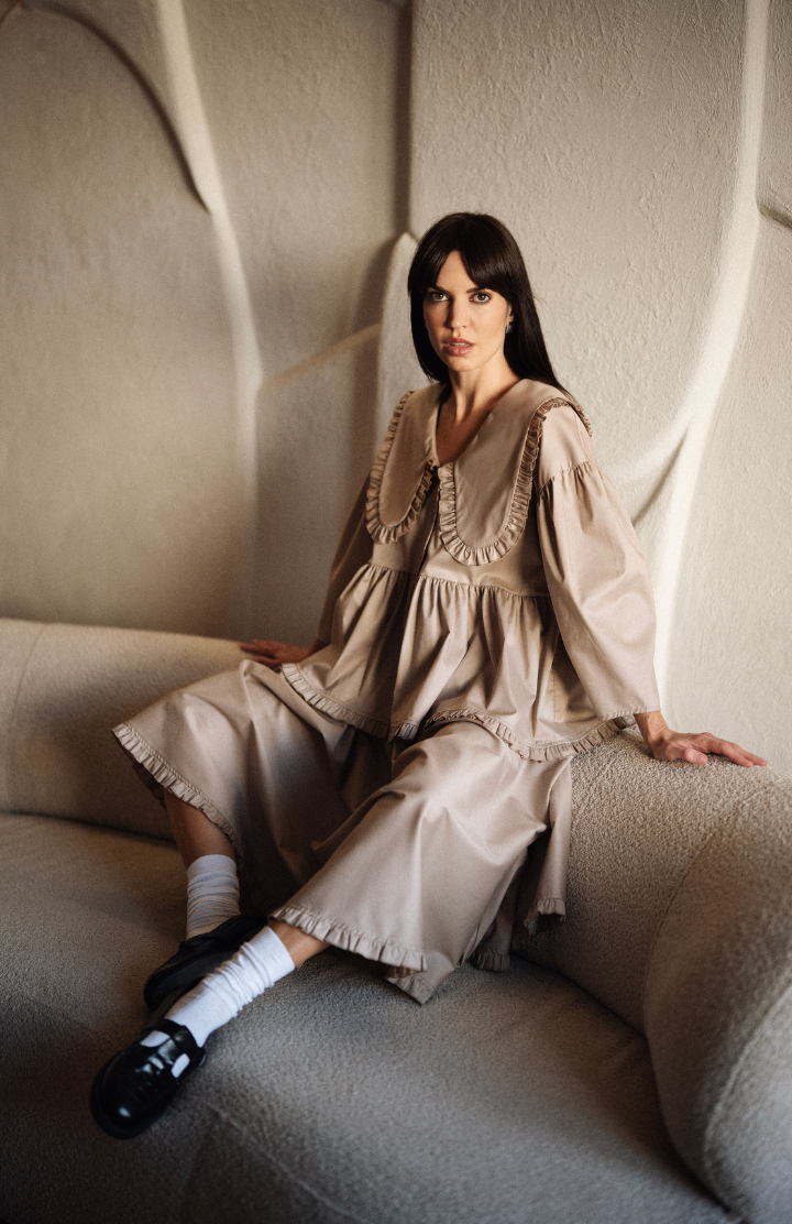 Tilda zachwyca swoim oversizowym fasonem z delikatnie rozkloszowaną linią i subtelnymi marszczeniami, które pięknie układają się przy każdym ruchu. Jej największym wyróżnikiem jest duży, falbankowy kołnierz – ikoniczny dla LES CHÉRRIES, budujący cały look bez wysiłku. Wystarczy założyć ją do ulubionej spódnicy, jeansów czy pod sweter, aby stworzyć stylizację z natychmiastowym efektem wow.