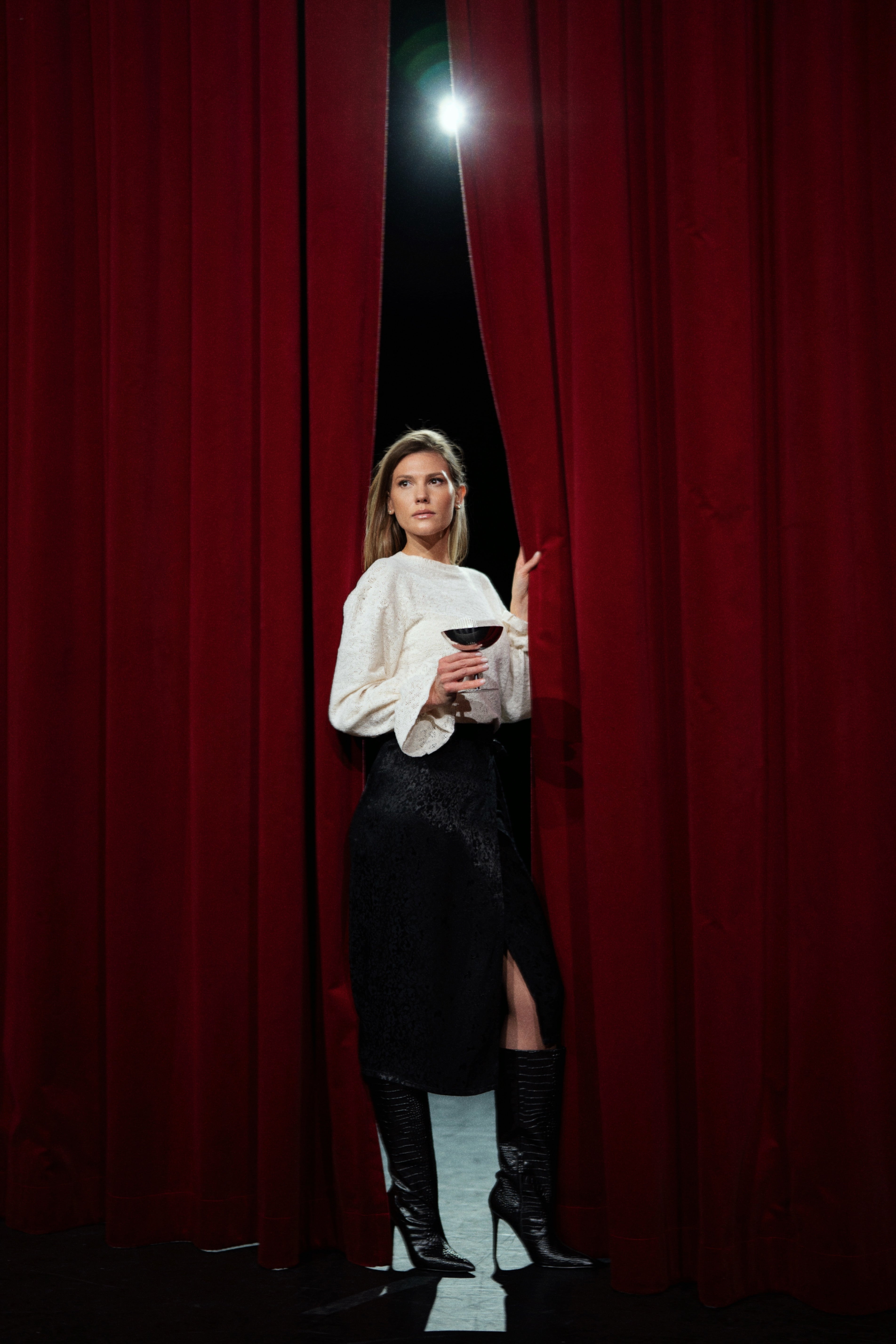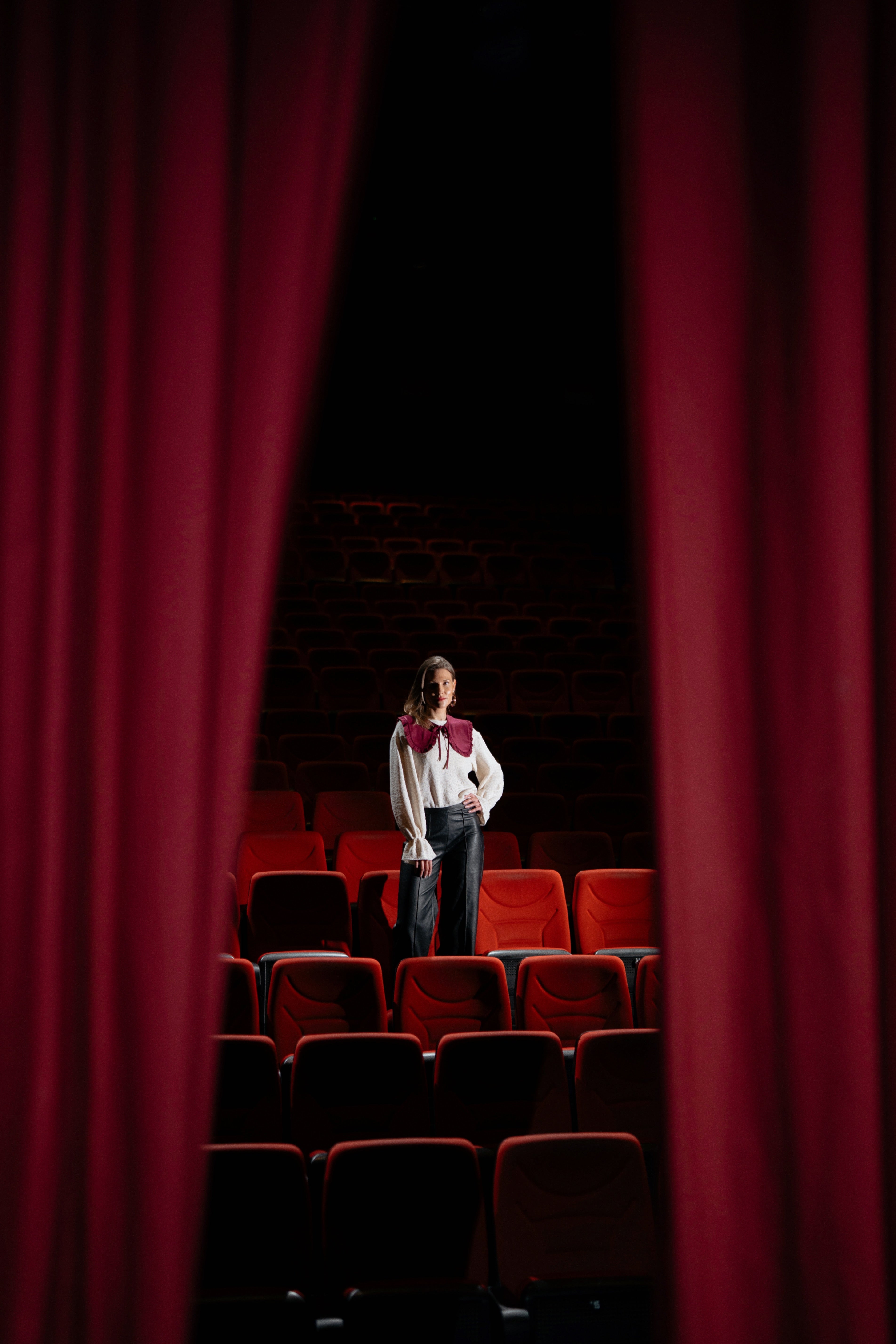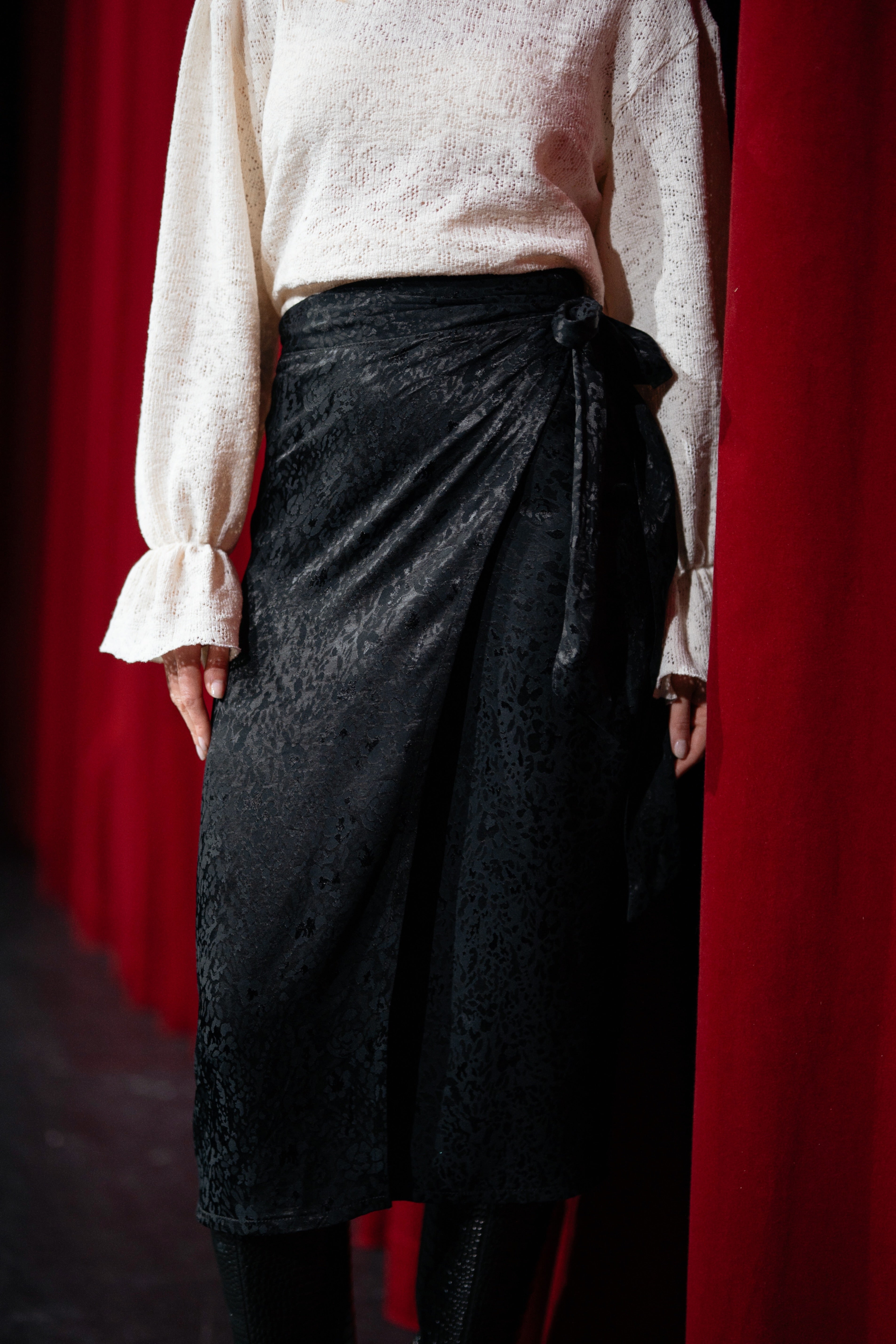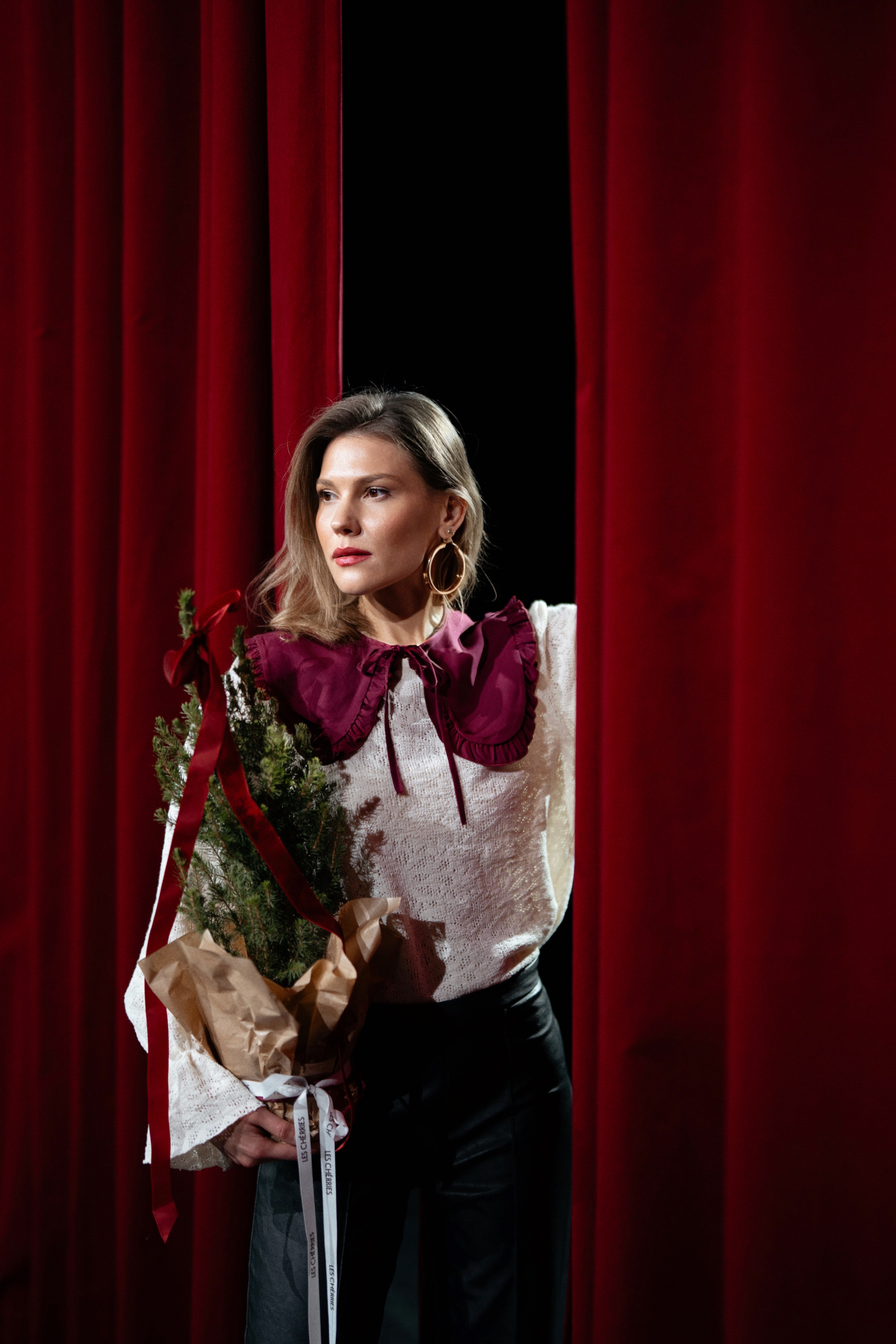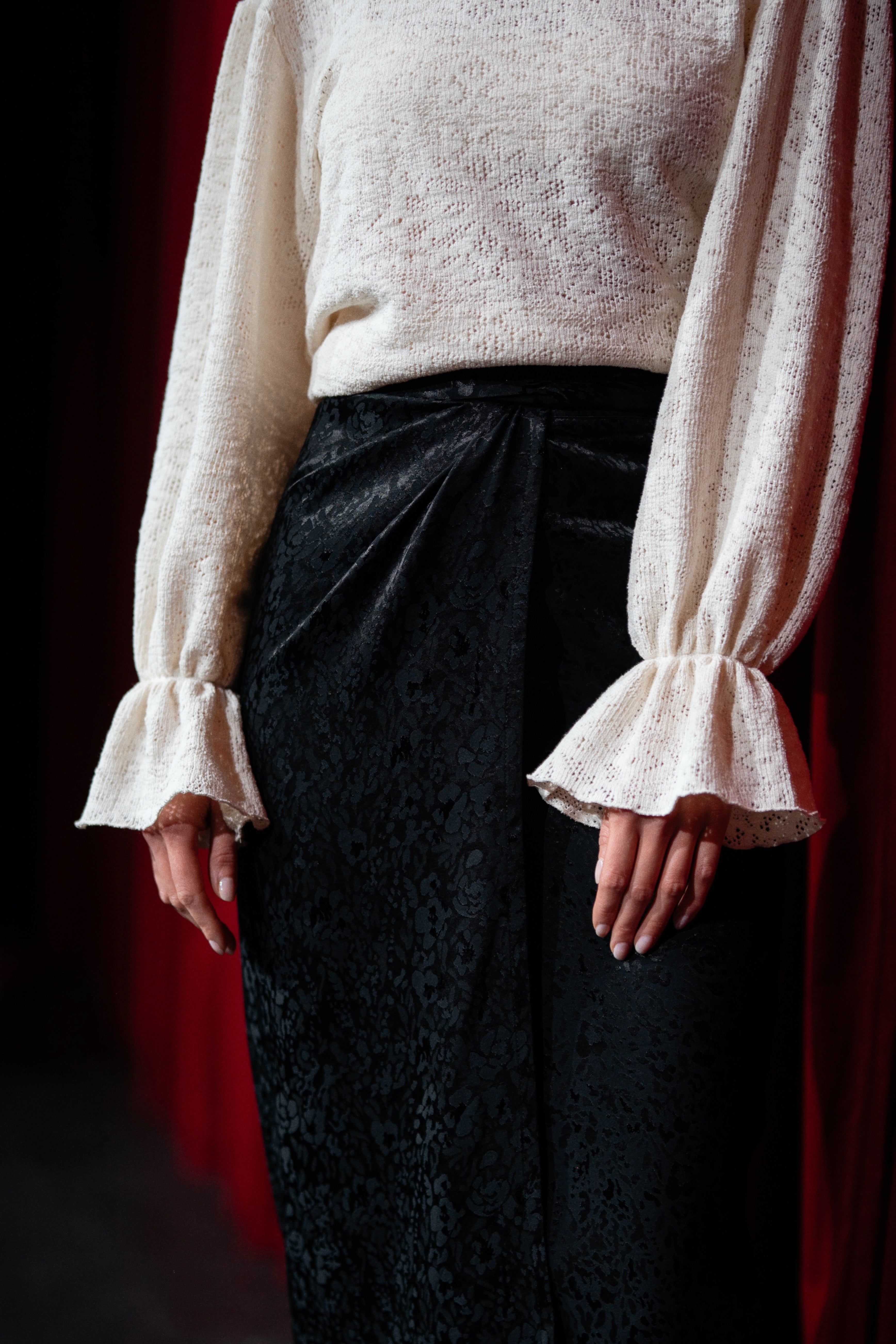 Najbardziej przyciągają uwagę romantyczne rękawy, które delikatnie falują przy każdym ruchu, nadając całości eterycznego charakteru. Kremowy odcień wprowadza miękkie, świetliste tony, dzięki którym stylizacja nabiera świeżości i wyrafinowania.