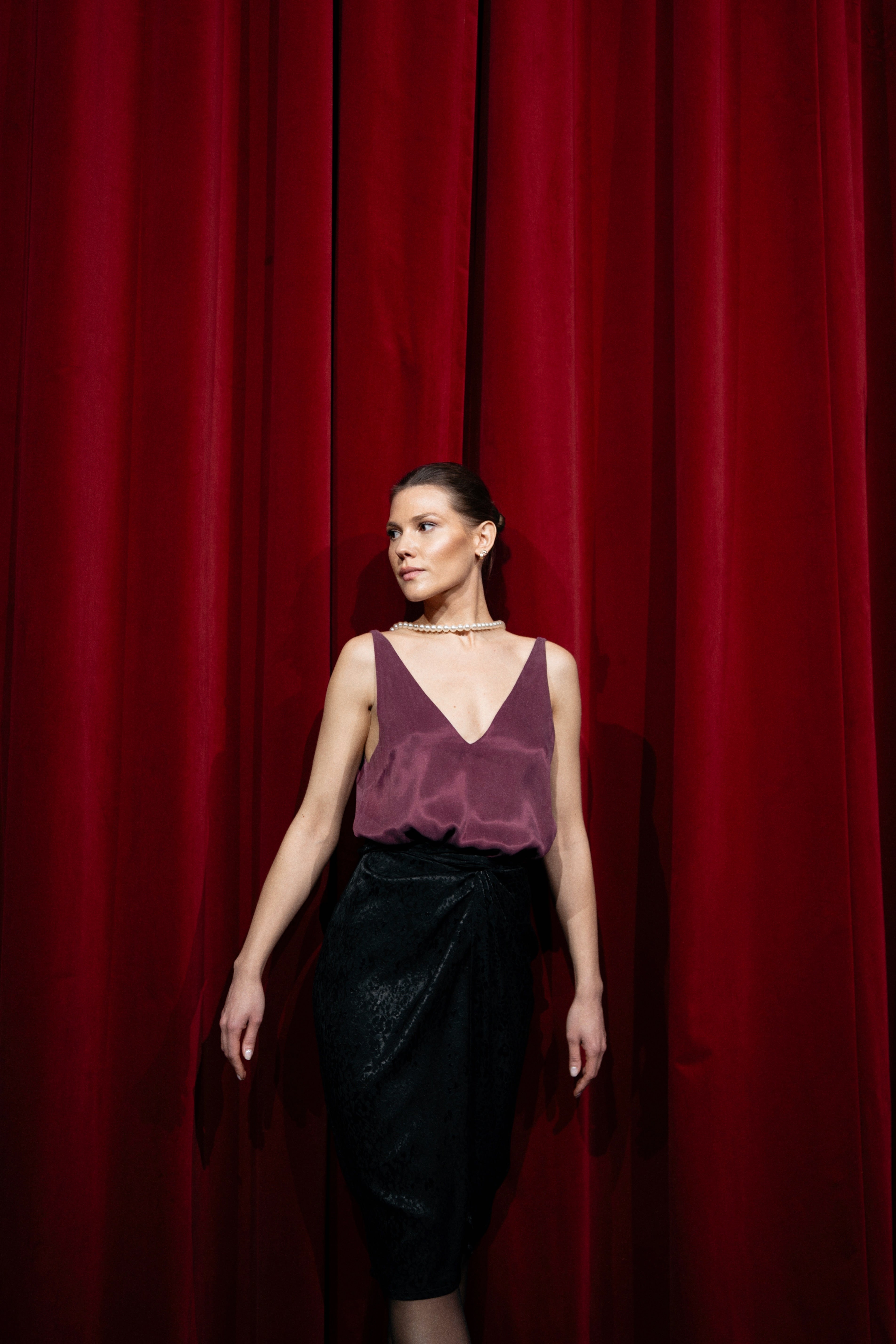 Spódnica BONNIE wygląda jak stworzona z myślą o scenie, fleszach i tych chwilach, w których potrzebujesz czegoś wyjątkowego — ale bez wysiłku. Wiskozowa midi o żakardowej fakturze przyciąga wzrok subtelnym połyskiem i misternym wzorem, który delikatnie odbija światło. To jeden z tych modeli, które robią wrażenie jeszcze zanim zdążysz się przedstawić.