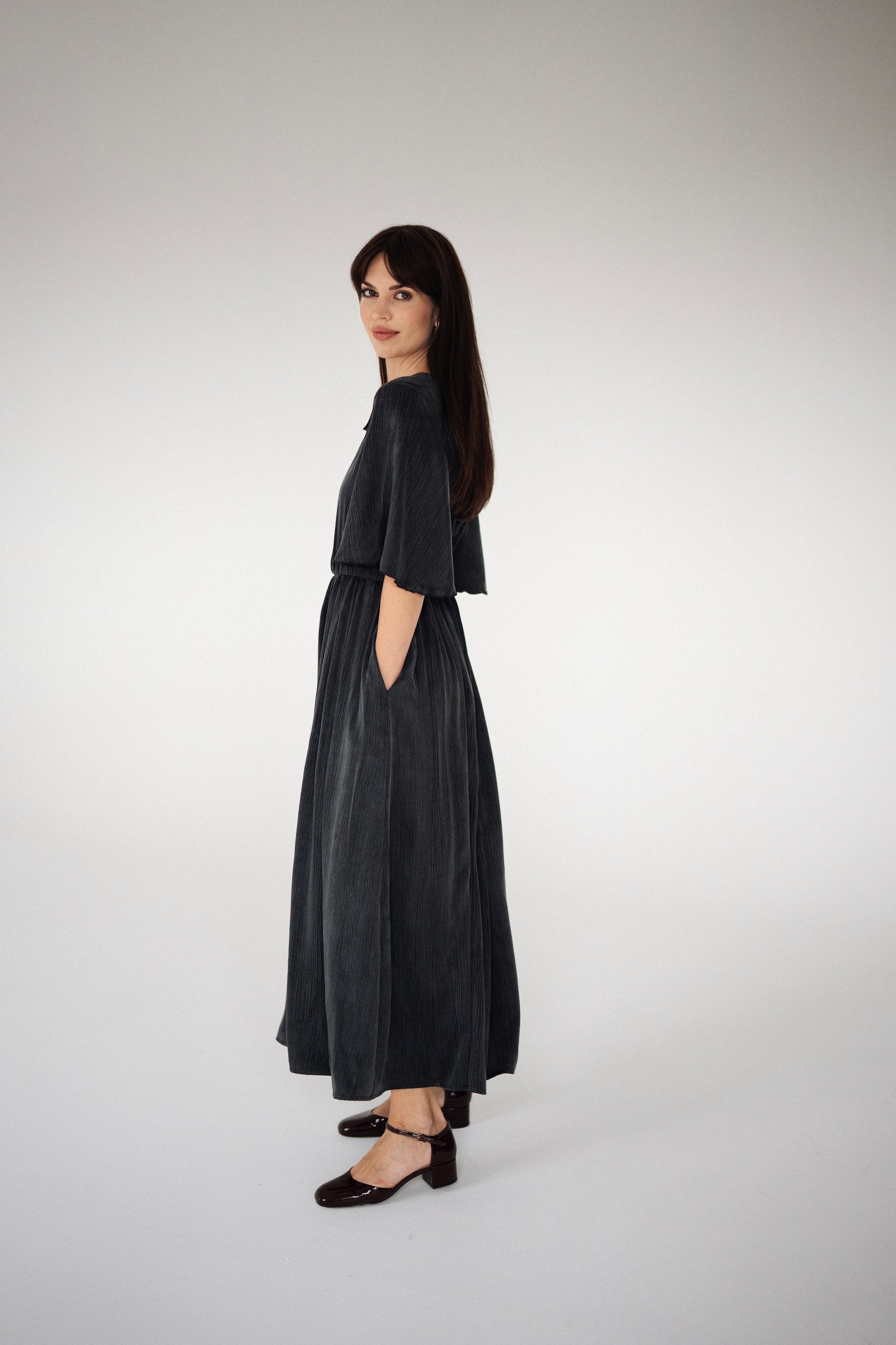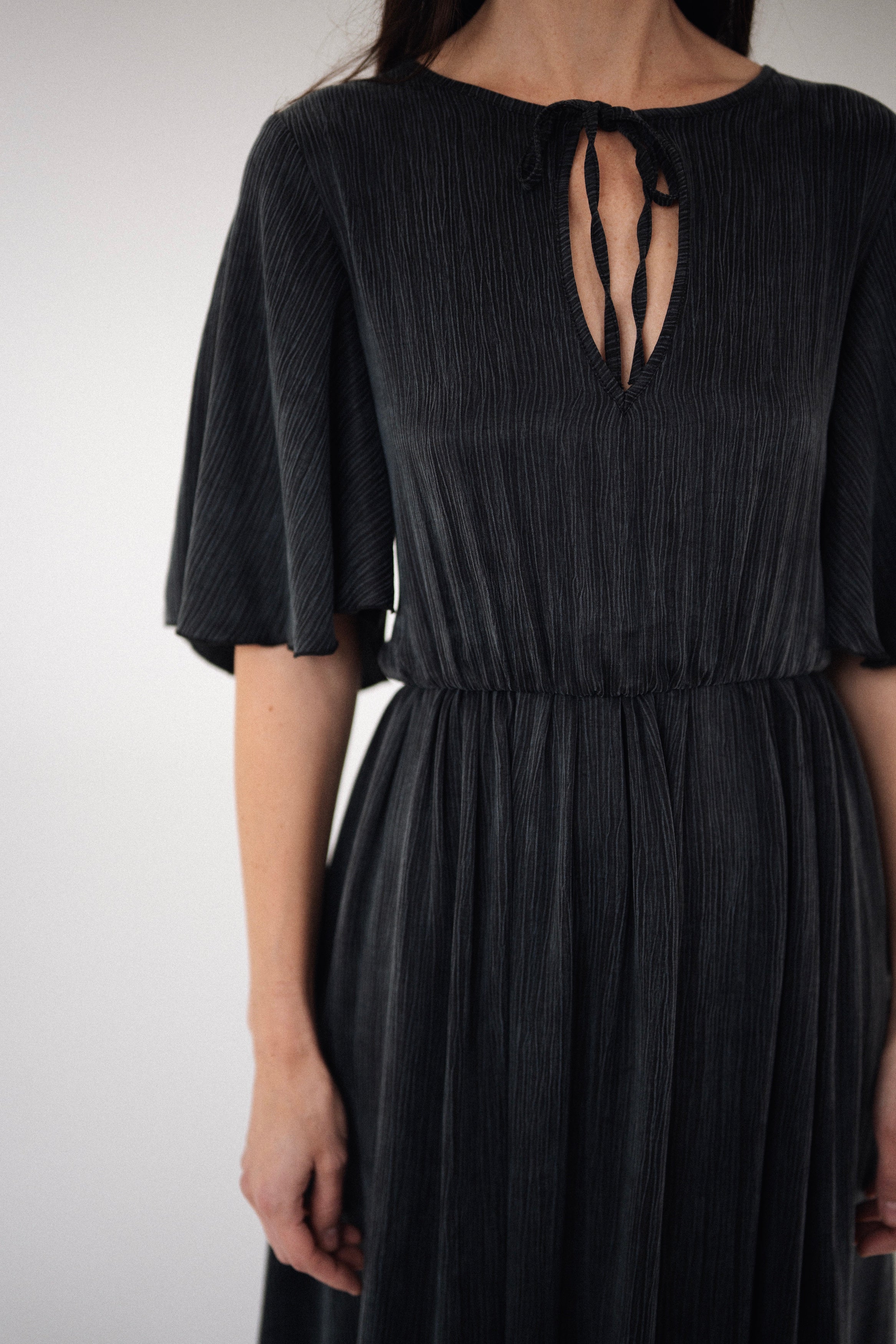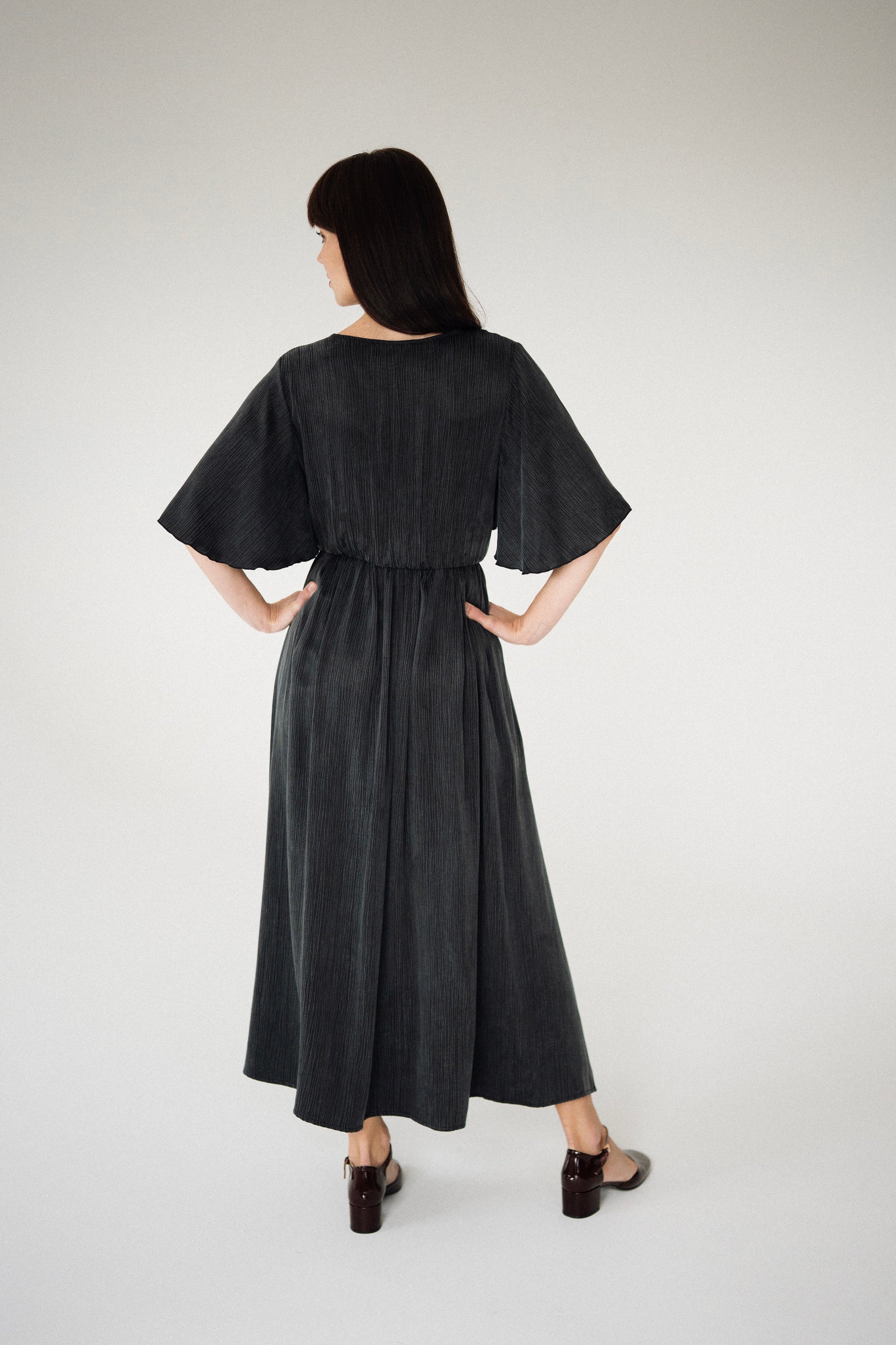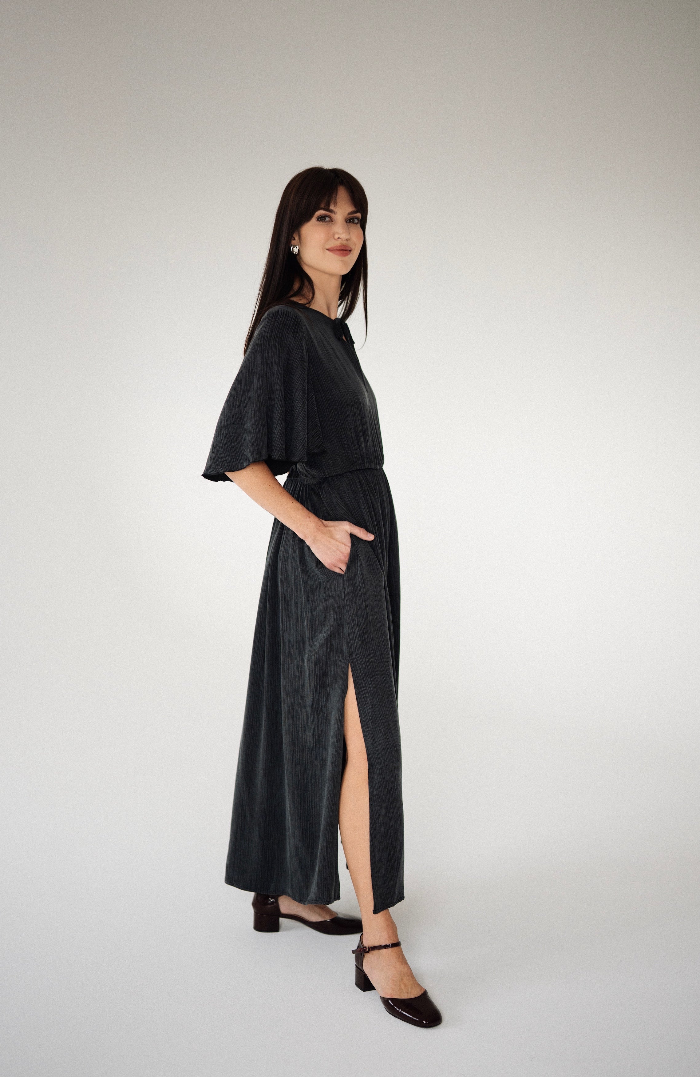 Linia A z elastyczną talią miękko opływa figurę, motylkowe rękawki równoważą proporcje, a pionowy print „plissé” i rozporek po prawej stronie wydłużają optycznie nogi. Długość midi = ponadczasowa elegancja.