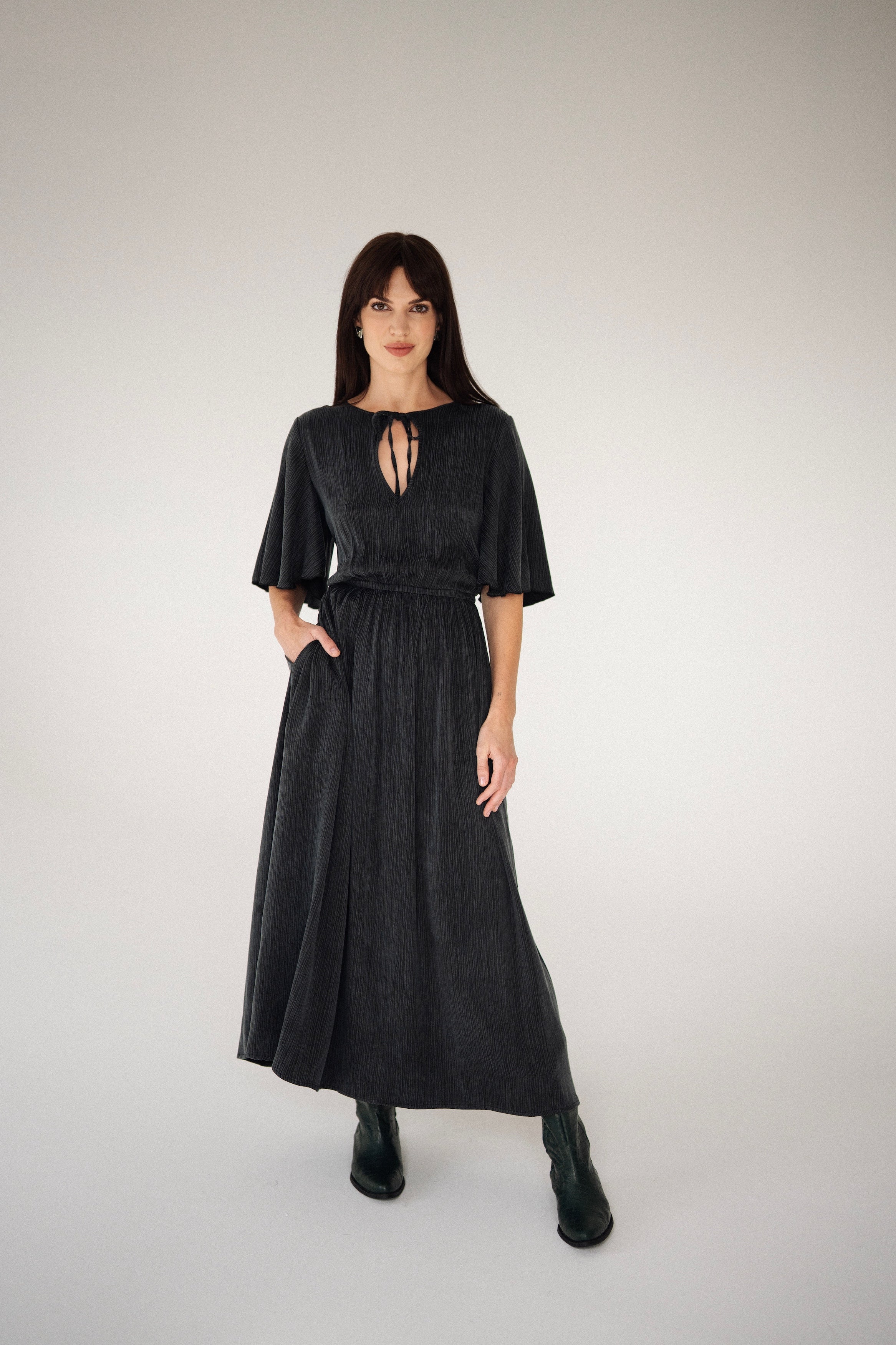 Miękka jak szept, z charakterem jak Twoje „oui”. Ta sukienka midi z wiskozy i lyocellu ma wszystko, co kochamy w les Chérries: motylkowe rękawki, dekolt–łezkę z wiązaniem i zmysłowy rozporek po prawej stronie. Subtelny print à la crinkle/plissé pięknie łapie światło, a elastyczna talia miękko podkreśla sylwetkę. I tak – ma kieszenie.