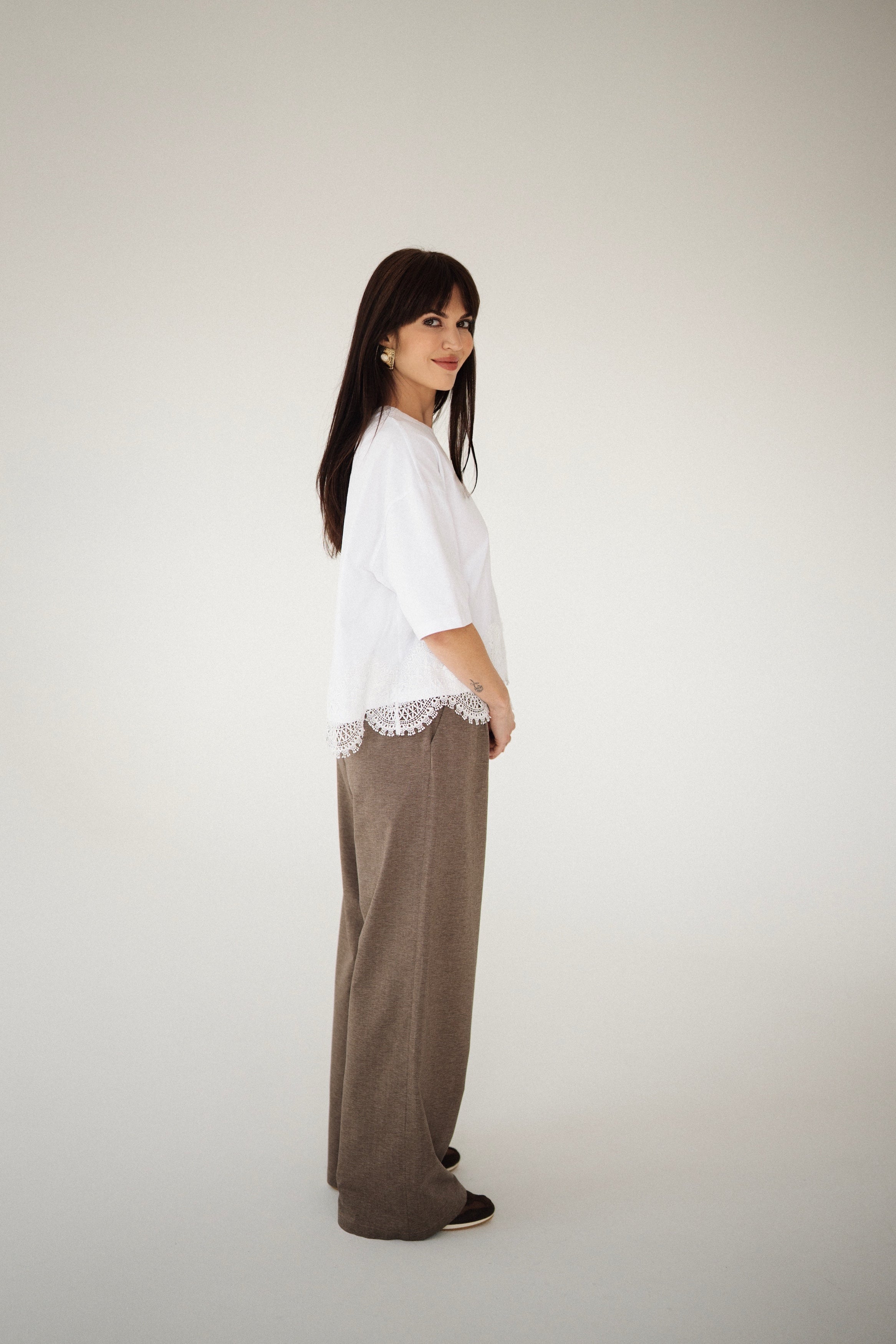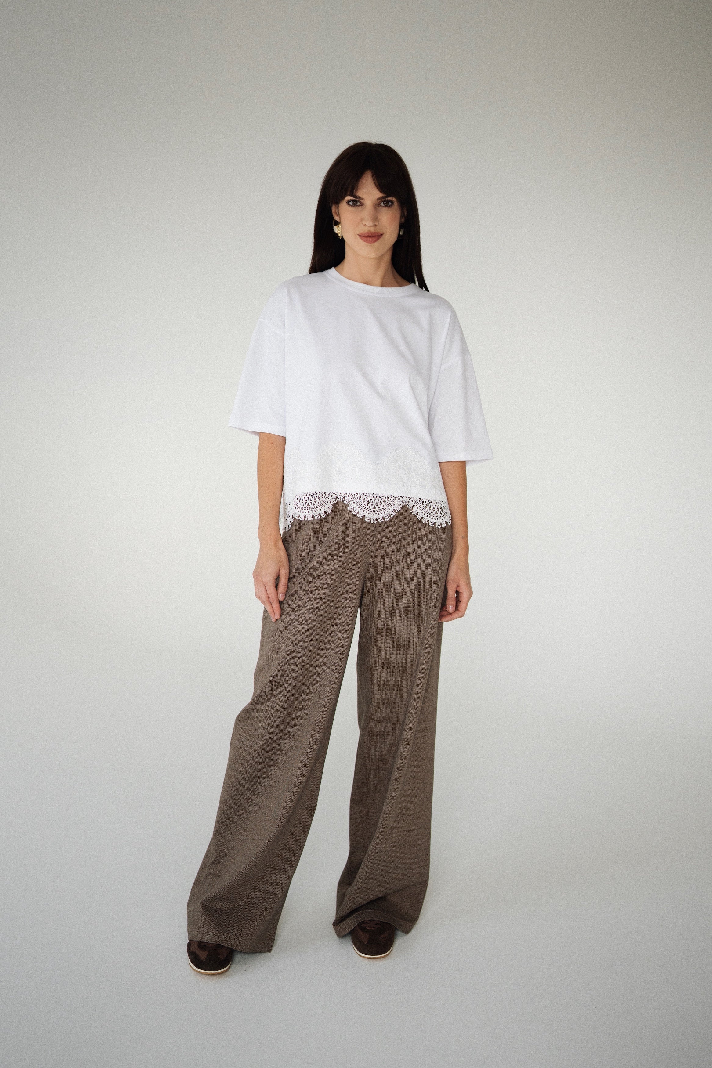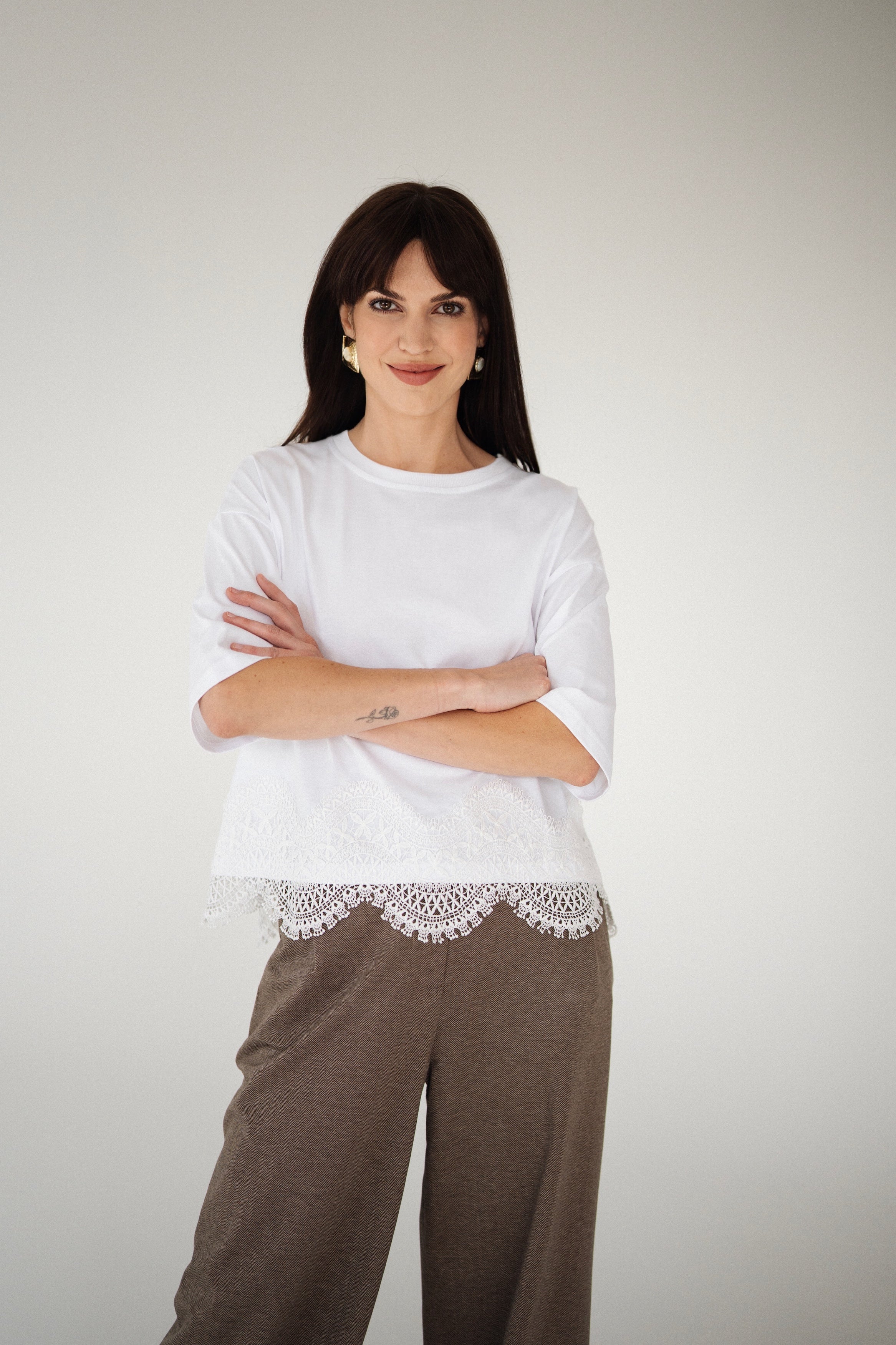 Biały, czysty, a jednak z twistem. Nasz T-shirt o pudełkowym kroju kończy się falującą koronką – jak croissant z delikatną kruszonką. Szeroki rękaw do łokcia i opuszczona linia ramion dodają luzu, a długość do bioder pięknie gra z wysokim stanem. „Easy chic”? Toujours.